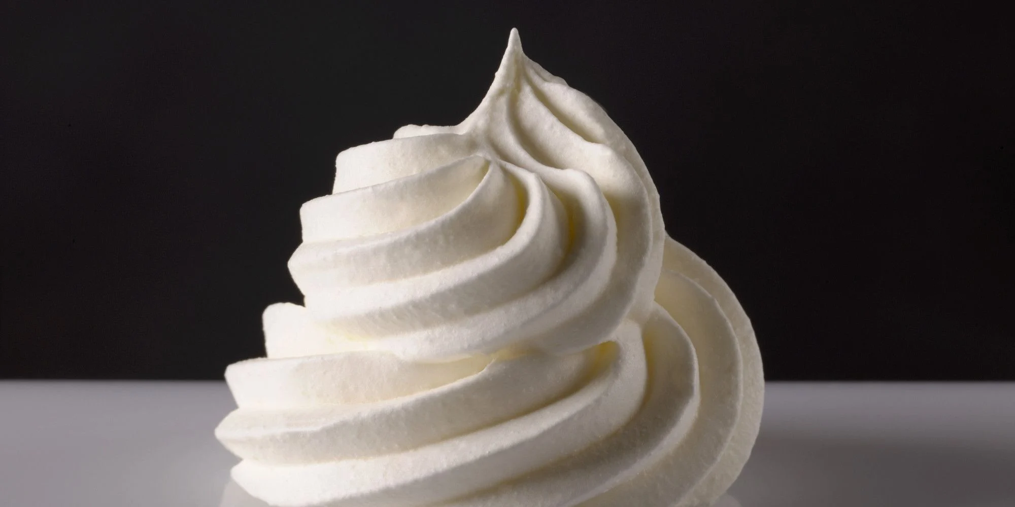 Whipped cream is a dessert topping made from cream, sugar, and sometimes flavorings. It is typically served on desserts such as ice cream, pies, and cakes. The whipped cream is then topped with a garnish such as chocolate shavings or a cherry.